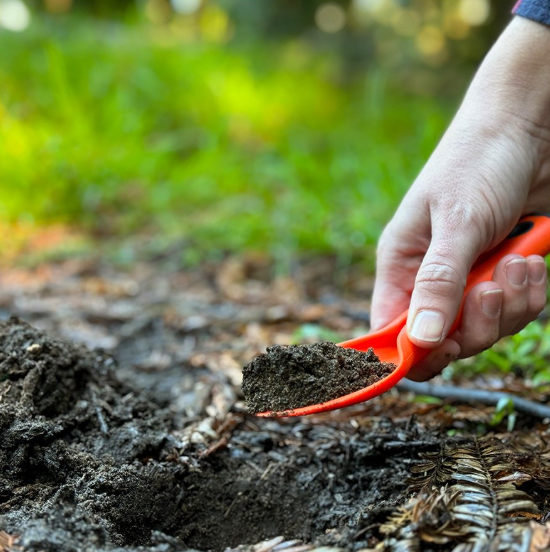 - 6” depth mark on the back notates the ideal depth of a cathole
